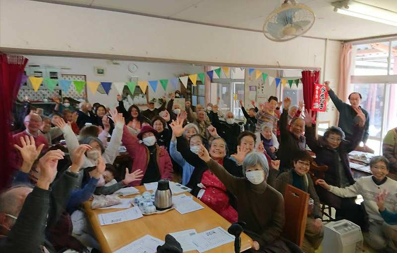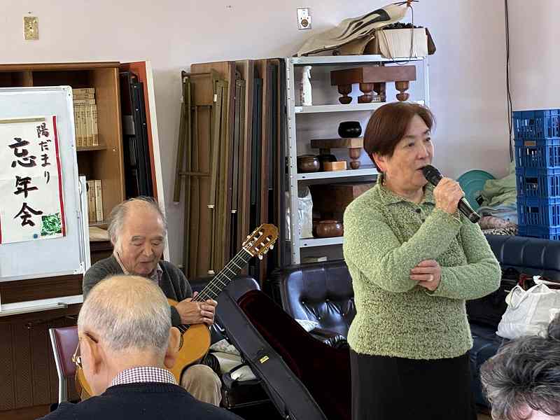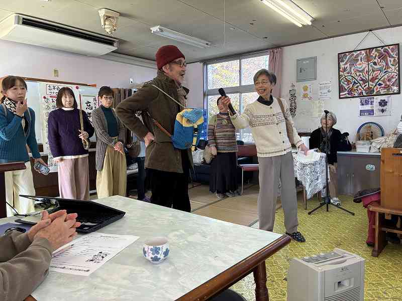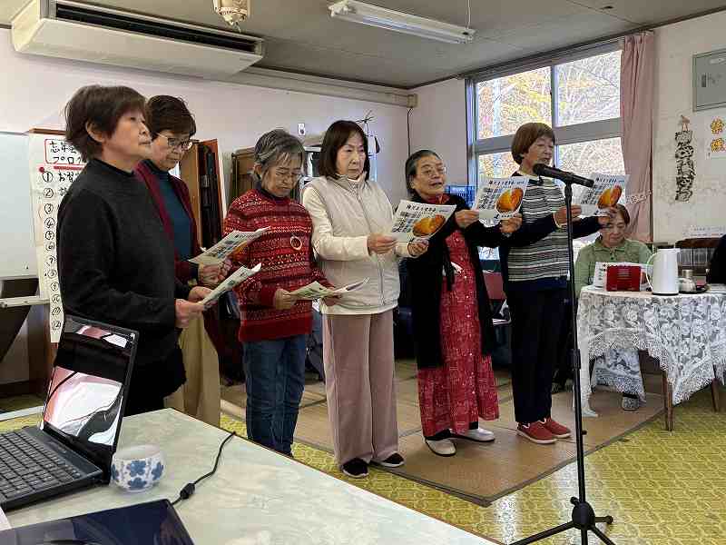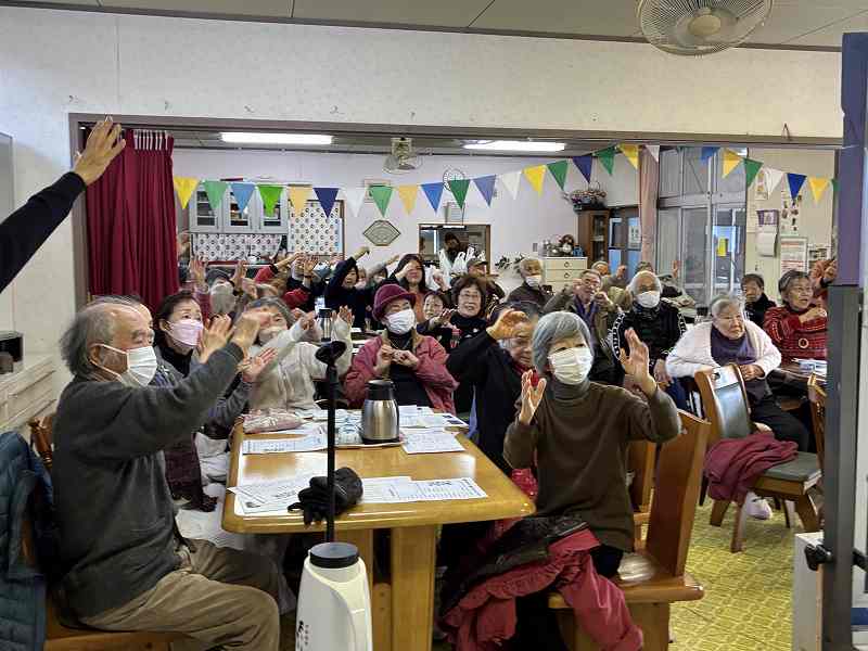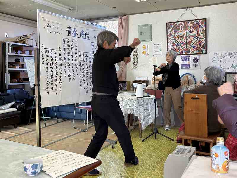 ・「福祉有償運送」「生活支援」「陽だまりトレーニング」は、それぞれの説明後、男性3人による歌と小山さんの振付で「青春時代」を参加者の皆さんと一緒に歌たい会場が一体になる。