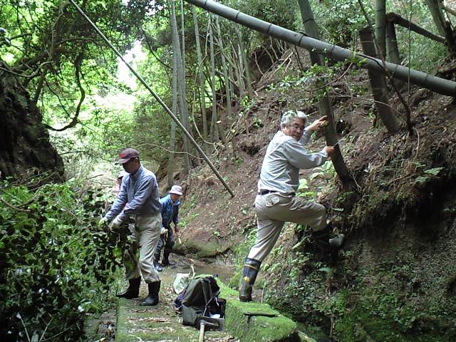 | D | 竹林へ入る(というより登るというのが正しい)ルートを検討する。谷は水が流れてぬかるみ状態になっている。竹の生えている個所は絶壁で登れない。ここへ段をつけるか、はしごをかけるか検討を要する。