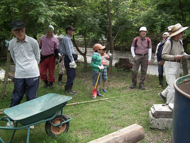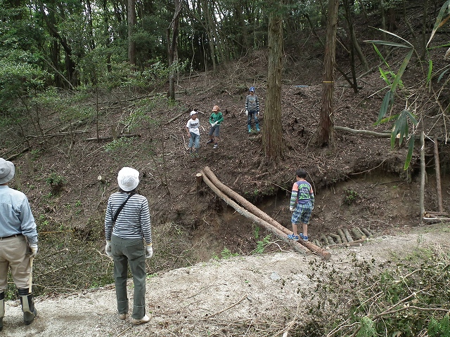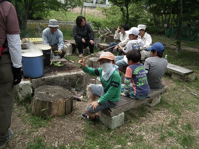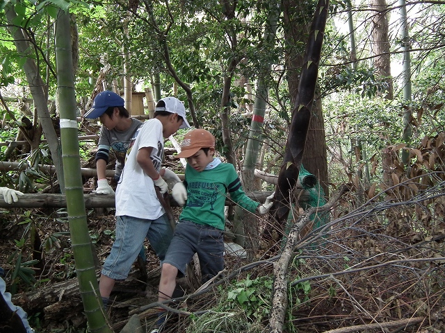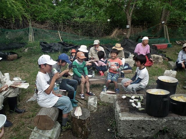 A 藤田宅の裏山でタケノコ狩りをする。小学生が率先してスコップを使っていた。かなり伸びたものを収穫する。