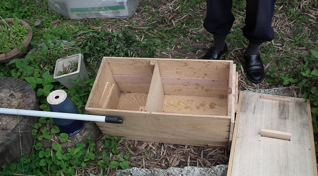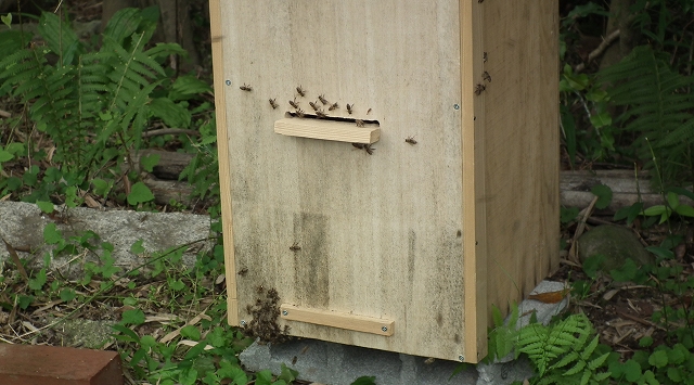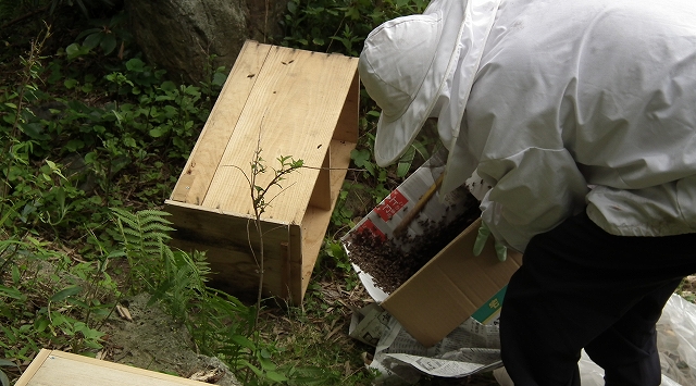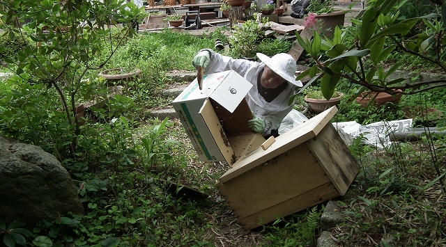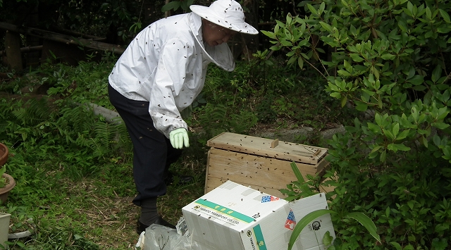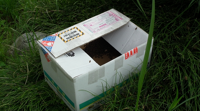 これを段ボールの箱で回収して、巣箱に移し替えました。