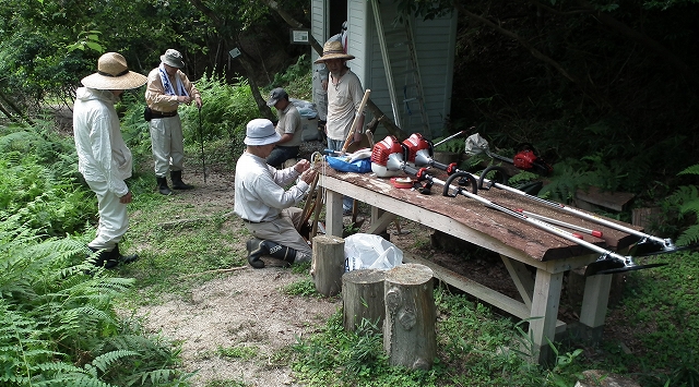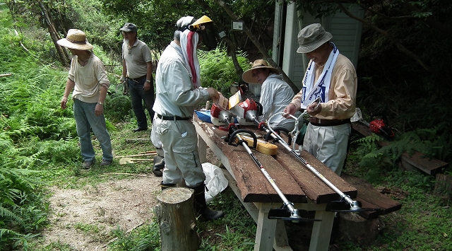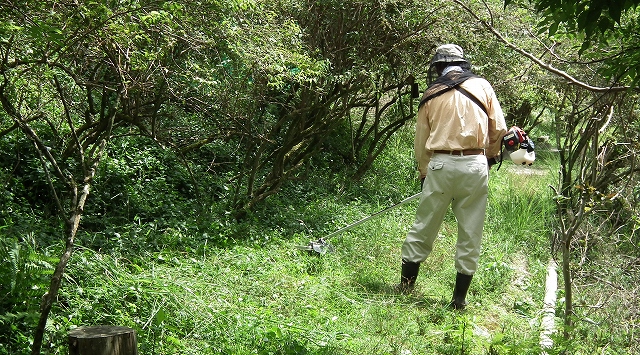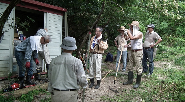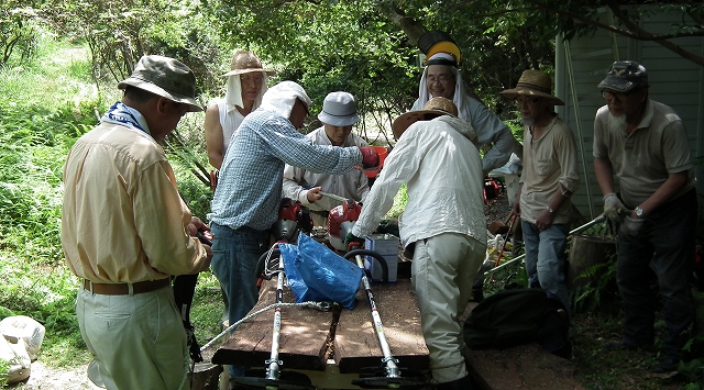 新たにブッシュカッター(草刈機)を購入したので、講習を受けた草壁幹事から使用法を学びつつ、周辺の草を刈り取った。