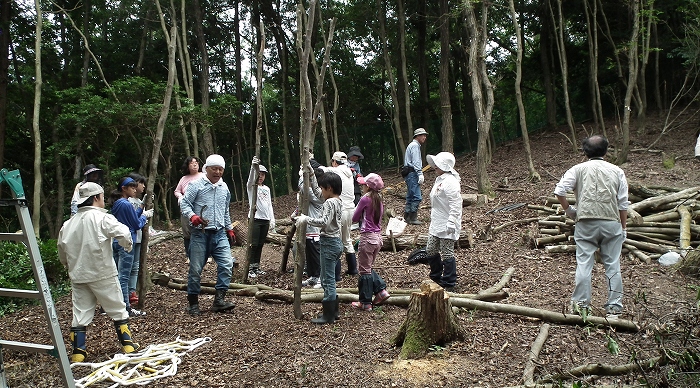 | C | 7本の棒を立ててあらかじめあけた穴に麻紐を通す。