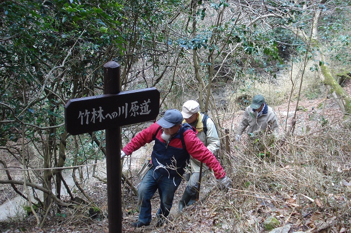 9.竹林から川沿いにヤブツバキの道を帰ります。