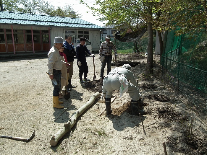 | @ | 4月26日(日)午前10時より、住民交流センターで初の植樹会を実施した。19日の予定が雨で流れたので再度実施したもの。