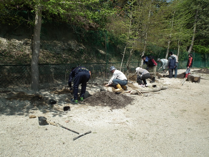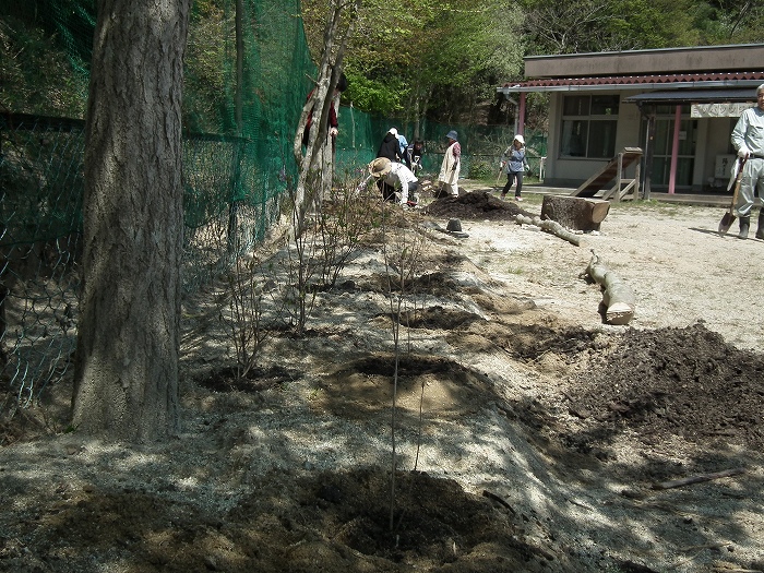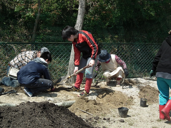 | B | はじめに植え方の手本を示した上で、各自で作業に着手した。穴掘り→バーク肥料入れ→苗木入れ→土入れ